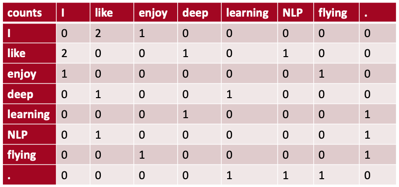 이 문장을 가지고 window based co-occurrence matrix를 만든 결과는 아래와 같다. 비슷하다고 생각되는 두 단어는 이 co-occurrence matrix에서 유사한 vector(행) 값을 가질 거라고 예측할 수 있다.