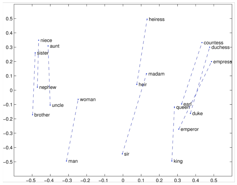 GloVe 모델을 사용하면 아래처럼 유사한 관계에 있는 단어들끼리 비슷한 Linear Property를 갖게 된다.