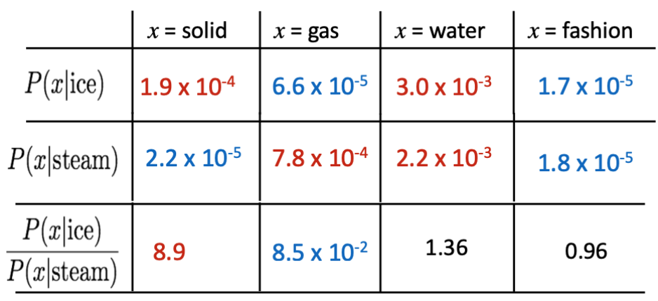 GloVe의 학습 방법을 살펴보자. 아래의 표는 전체 학습 말뭉치 중 두 단어가 동시에 등장한 빈도를 각각 센 다음 전체 말뭉치의 단어 개수로 나눈 동시 등장 확률을 나타낸 표다. 예를 들어, 전체 말뭉치에서 'ice'와 'solid'가 동시에 등장할 확률은 0.00019다. 'steam'이 등장했을 때 'solid'도 동시에 등장할 확률은 0.00019보다 훨씬 낮은 0.000022다. 'ice'가 'steam'보다 'solid'와 더 연관성이 높으므로 당연한 결과다. 그러므로 $\cfrac{P(solid|ice)}{P(solid|steam)}$은 1보다 훨씬 큰 8.9를 갖는다. 이것과는 반대로 x가 water나 fashion일 때처럼 두 단어 벡터 모두 관련성이 높거나 별로 없는 경우는 1에 가까운 값이 나온다.