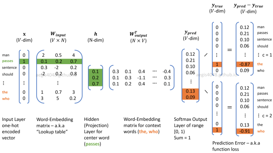 위 이미지는 기존 skip-gram의 작동 방식을 표현한 그림이다. 한 중심 단어에 대해 어떤 단어가 주변에 등장할 확률인 softmax output $y_{pred}$와 실제 주변 단어의 one-hot vector인 $y_{true}$와의 차이를 구해 error를 구하며, 이 과정에서 주변에 등장하지 않는 단어들과의 error를 구해 $y_{pred}$를 갱신하게 되므로 계산이 비효율적이게 되는 것이다.