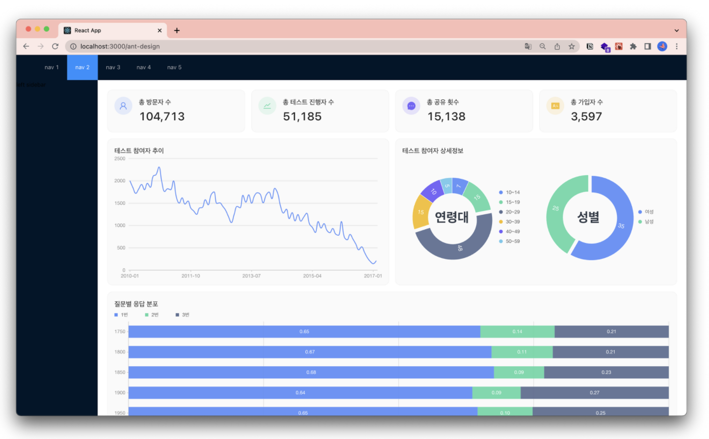 Ant Design에서 자체적으로 제작한 차트 라이브러리가 있다. 덕분에 Ant Design + Ant Design Charts로 통일감있는 디자인의 대시보드를 만들 수 있다. 일부분 영어 번역을 제공하고 있으나 대부분의 문서와 예제 코드는 중국어로 작성, 설명되어 있다. 다만 사용에 문제가 될 정도의 불편함은 아니다.